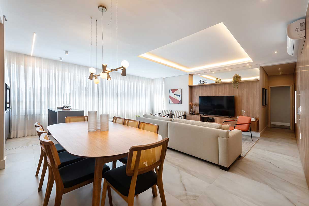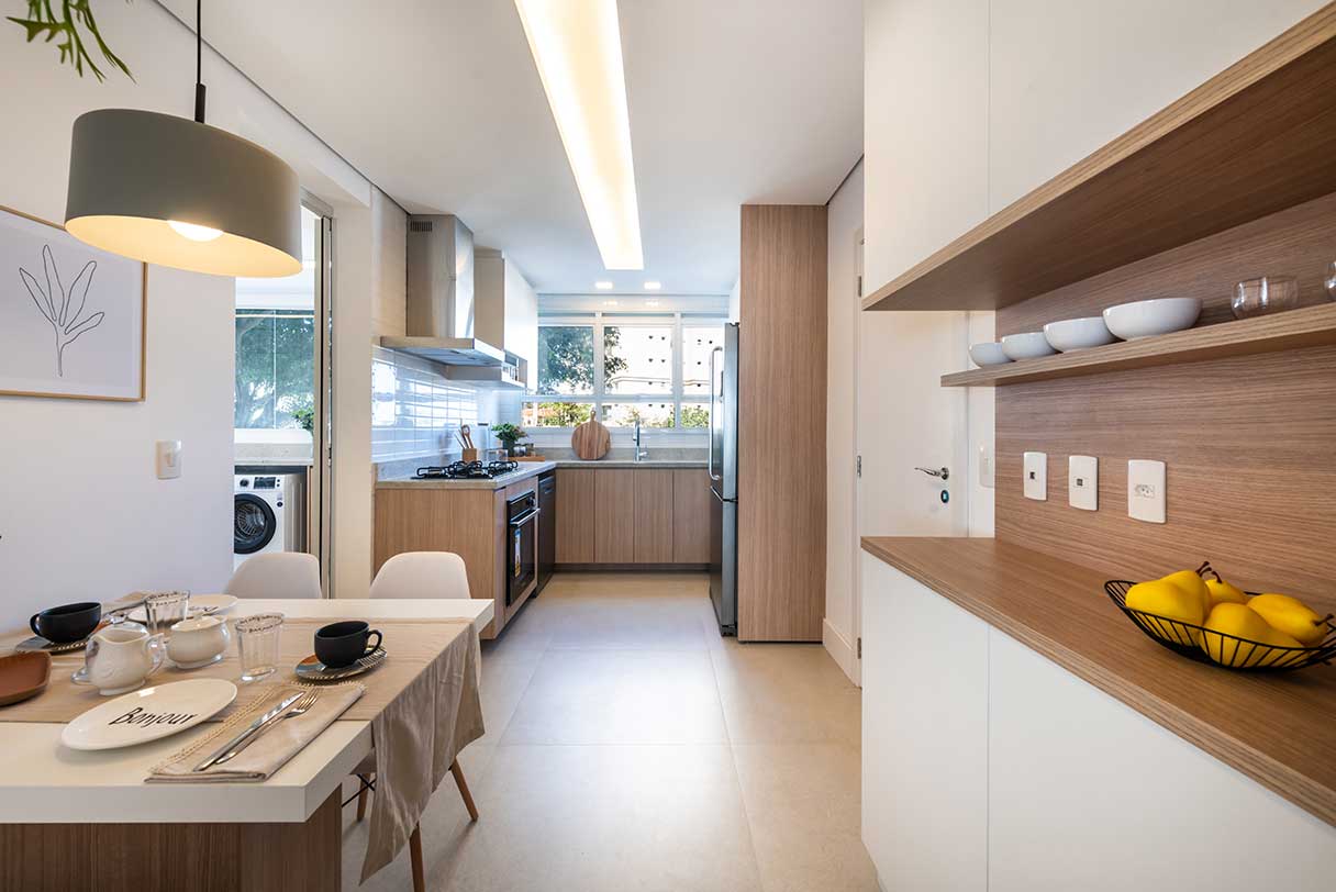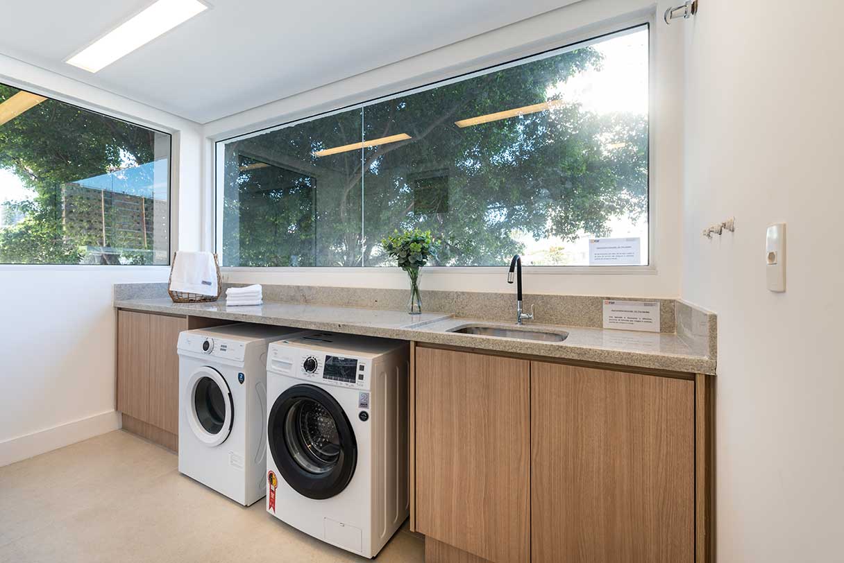 Porcelanato no piso dos banheiros, terraço, cozinha e área de serviço.