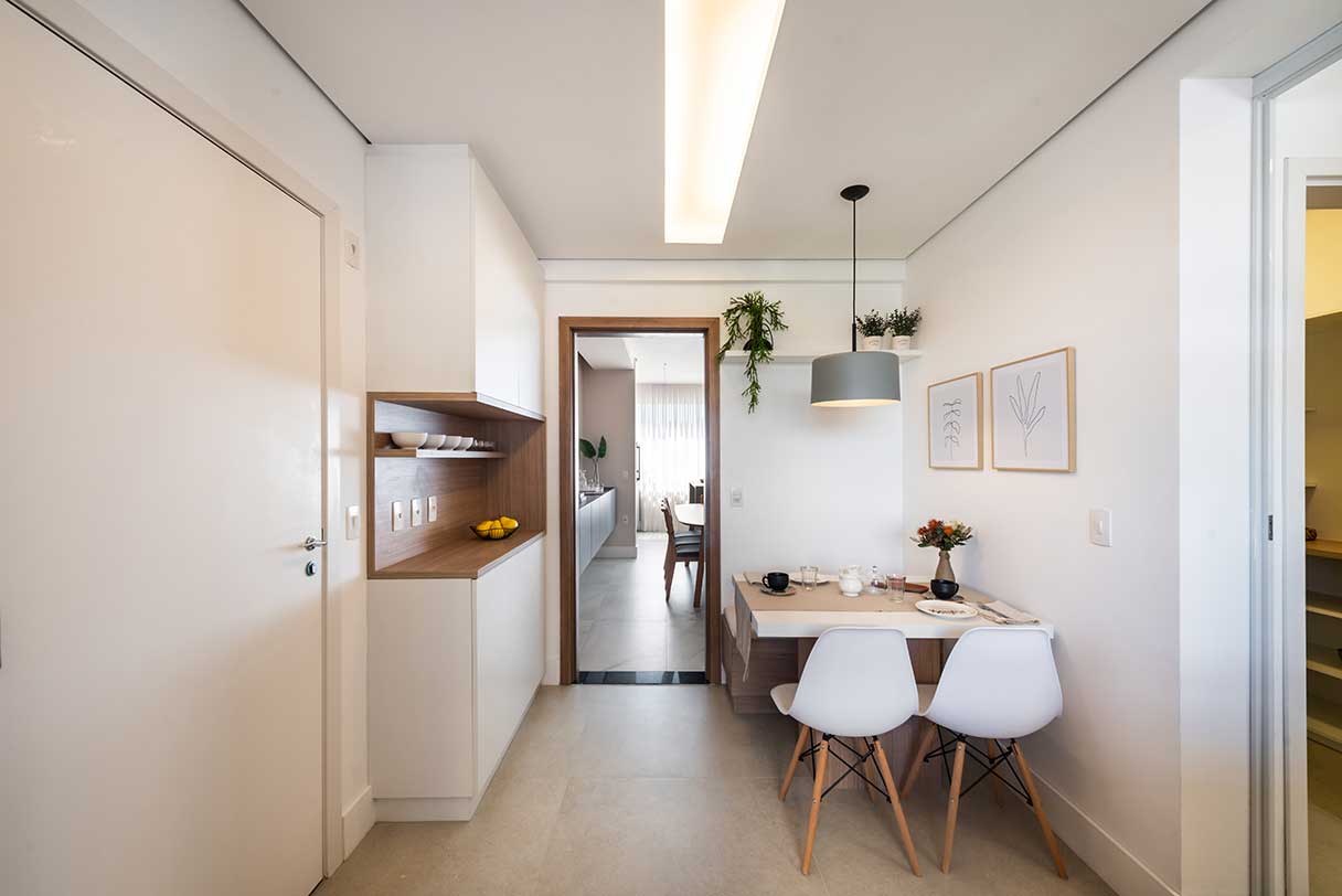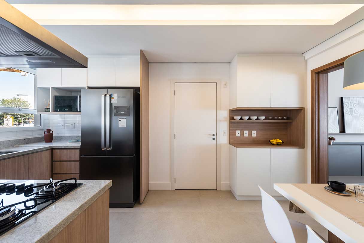 Porcelanato no piso dos banheiros, terraço, cozinha e área de serviço.